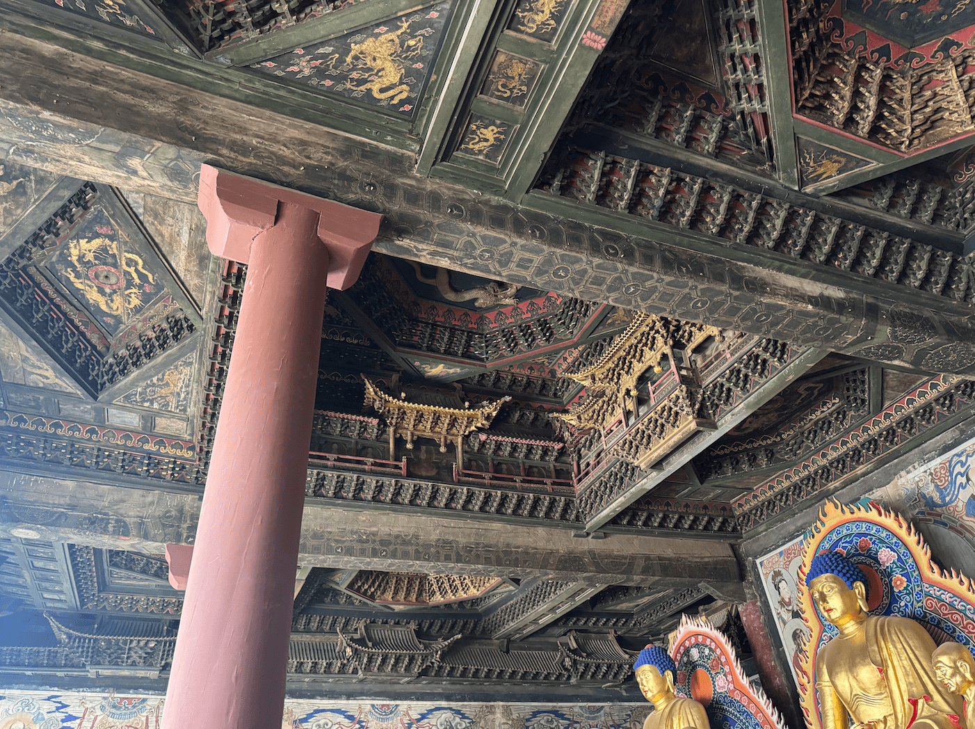 云冈石窟的巨型造像让人震撼,呆在窟内满墙佛像的空间充满沉浸感;悬空寺的鬼斧神工让人惊叹,登临的感受又是惊险敬畏;净土寺的藻井华丽、让人联想到天宫;应县木塔的纯木构建筑,在当时能达到这样的楼高,想必也是罕见。